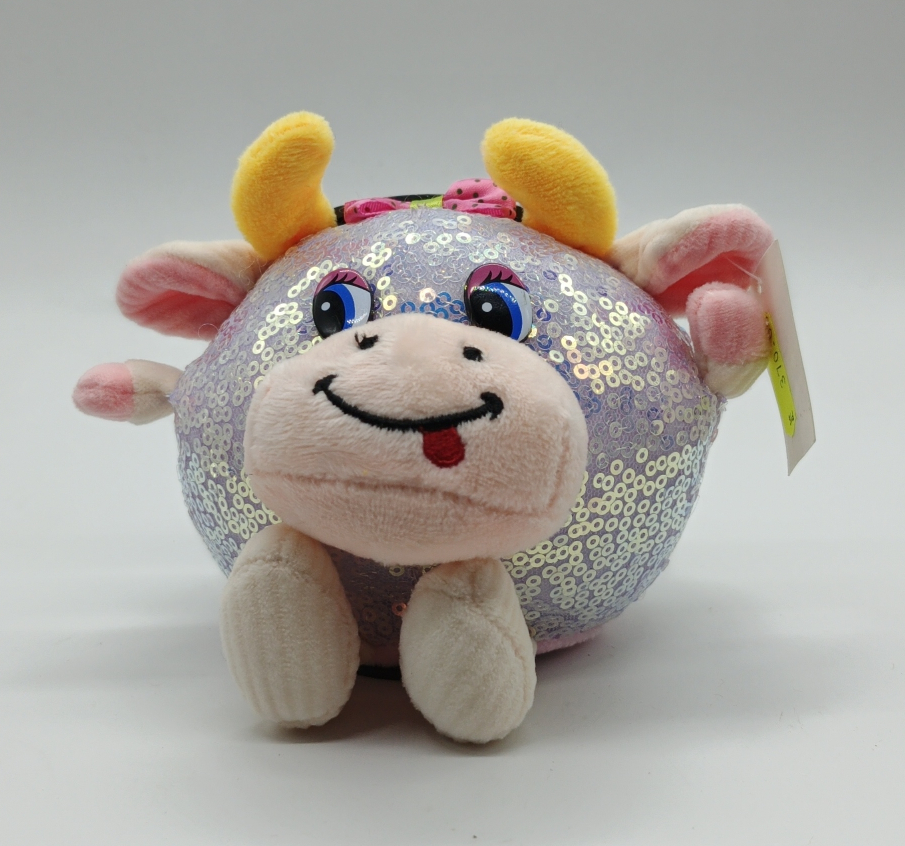 Копилка круглая в виде коровки. При закидывании монетки копилка начинает петь.