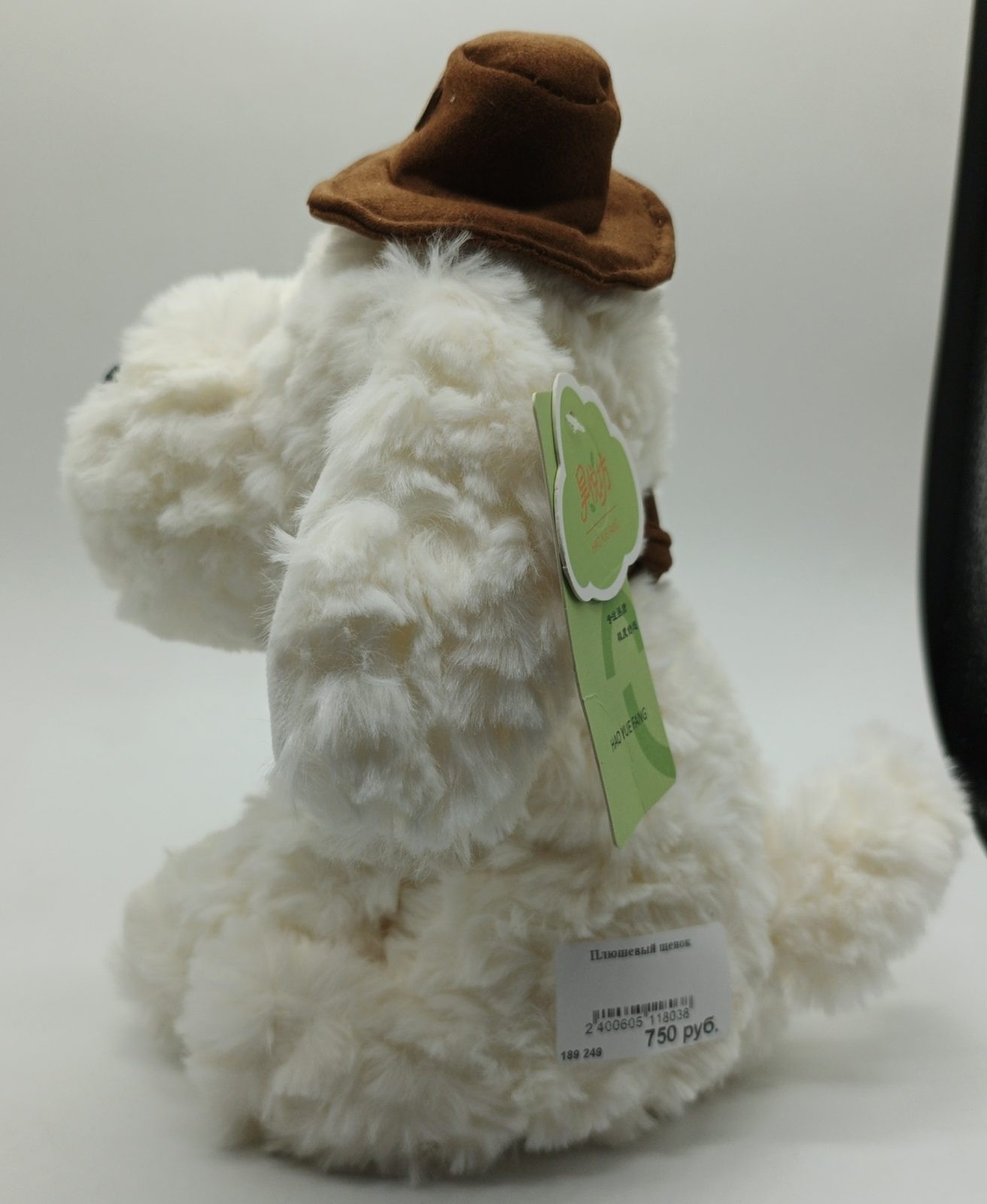 Мягкая игрушка. Белая собачка в ковбойской шляпе и платке. На платке надпись Fashion Gloves